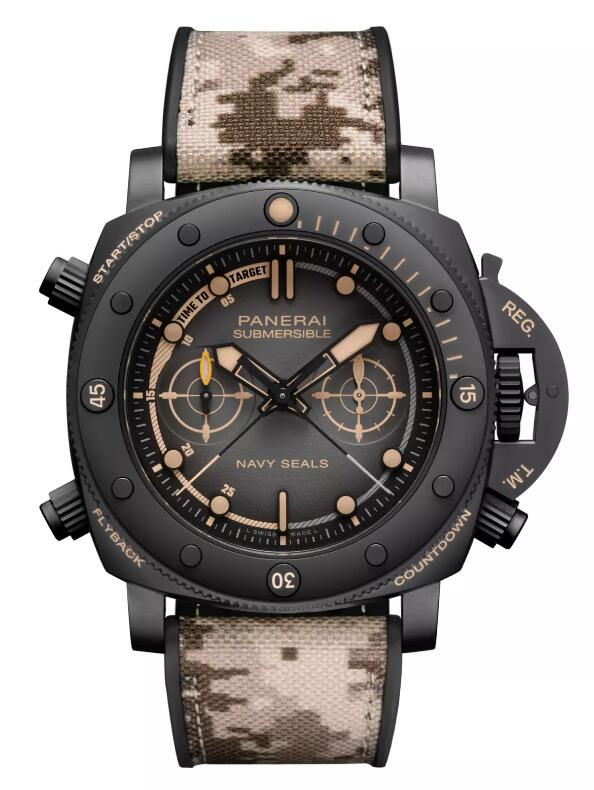 This Panerai Submersible Chrono replica watches with Swiss movements comes on a bi-material camo textile and rubber strap with trapezoidal titanium buckle with DLC coating. You will also get an additional black rubber strap. The price tag of this Panerai Navy SEALs is around 30 to 35k and the model is limited to 80 pieces only.